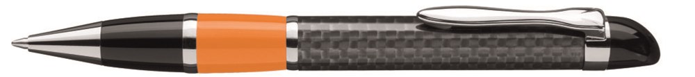 Edler Carbonfaser Metalldrehkugelschreiber mit farbiger Griffzone, flexiblem Metallclip, Metallzierring und Metallspitze glanzverchromt.