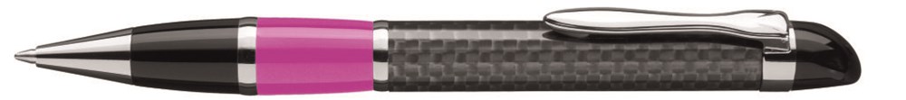 Edler Carbonfaser Metalldrehkugelschreiber mit farbiger Griffzone, flexiblem Metallclip, Metallzierring und Metallspitze glanzverchromt.
