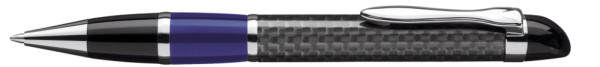 Edler Carbonfaser Metalldrehkugelschreiber mit farbiger Griffzone, flexiblem Metallclip, Metallzierring und Metallspitze glanzverchromt.