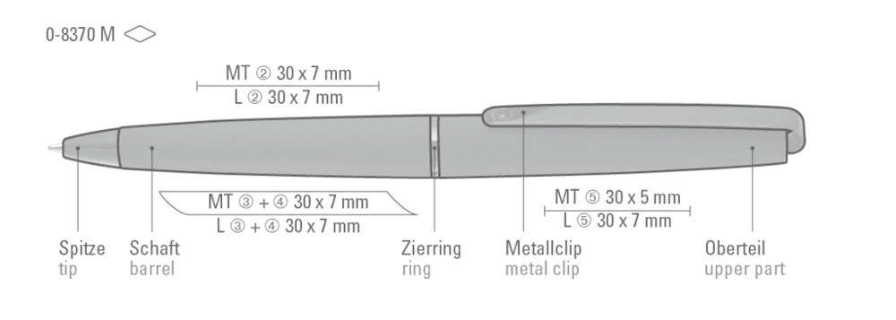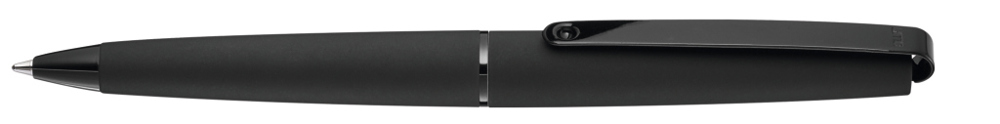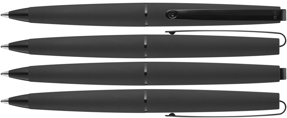 Metall-Drehkugelschreiber mit Softdrehmechanik und matt lackiertem Gehäuse. Langer flexiblem Metallclip, Zierring und Spitze schwarz glänzend.