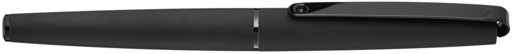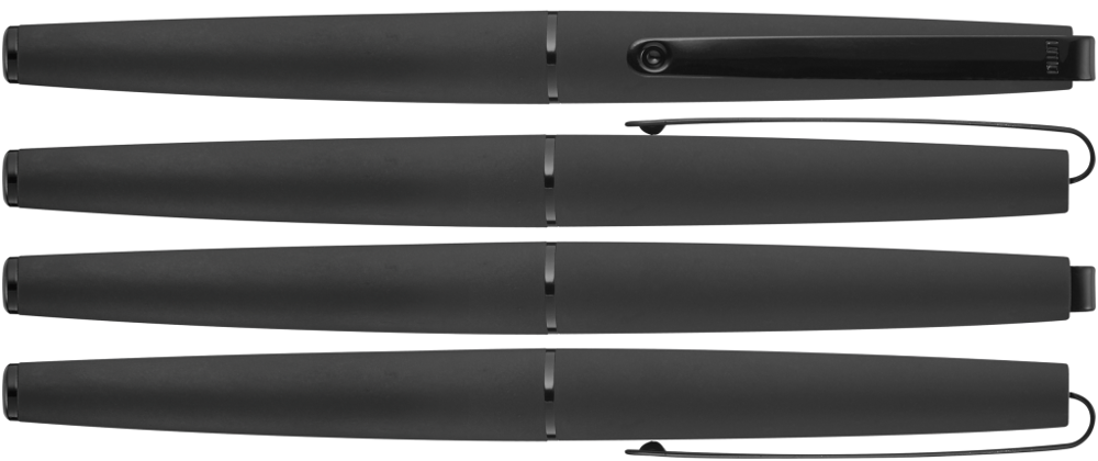 Metall-Rollerball mit matt lackiertem Gehäuse. Langer flexibler Metallclip, Zierring und Stopfen schwarz glänzend. Griffzone gerillt schwarz glänzend.