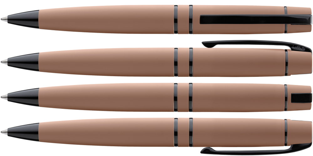 Metall-Drehkugelschreiber mit Softtouch-Gehäuse, Softdrehmechanik und gefedertem Clip. Beschlagteile schwarz glänzend lackiert.