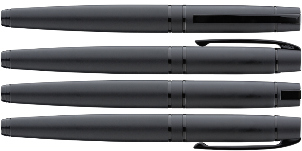 Metall-Rollerball mit Softtouch-Gehäuse, gefedertem Clip und schwarzer Gummigriffzone. Beschlagteile schwarz glänzend lackiert.