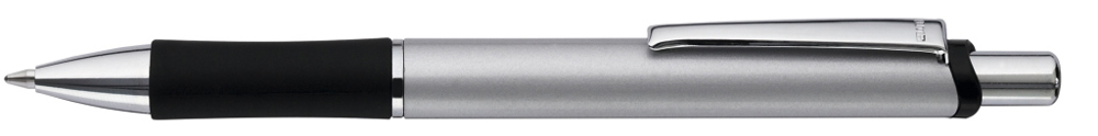 Metall-Druckkugelschreiber mit lackiertem Aluminiumschaft. Schwarzer Gummigriffzone und Metallclip.