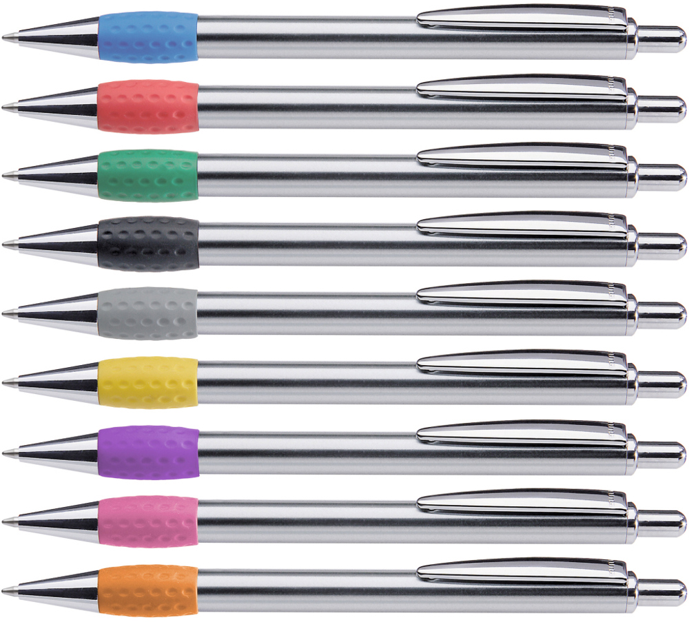 Metall-Druckkugelschreiber mit Schaft, Drücker, Clip und Spitze glanzverchromt. Gummigriffzone farbig.