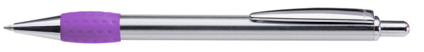 Metall-Druckkugelschreiber mit Schaft, Drücker, Clip und Spitze glanzverchromt. Gummigriffzone farbig.
