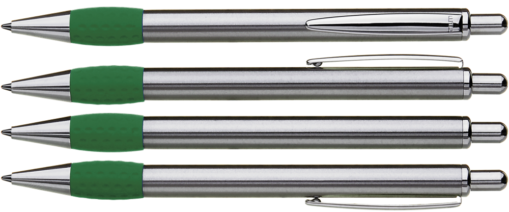 Metall-Druckkugelschreiber mit Schaft, Drücker, Clip und Spitze glanzverchromt. Gummigriffzone farbig.