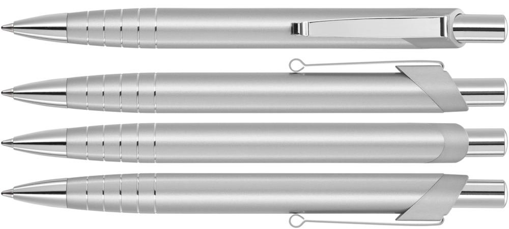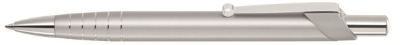 Metall-Druckkugelschreiber mit silbernen Zierringen im Gehäuse und elastischem Metallclip. Spitze und Drücker silber glänzend.