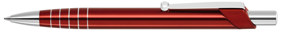 Metall-Druckkugelschreiber mit silbernen Zierringen im Gehäuse und elastischem Metallclip. Spitze und Drücker silber glänzend.