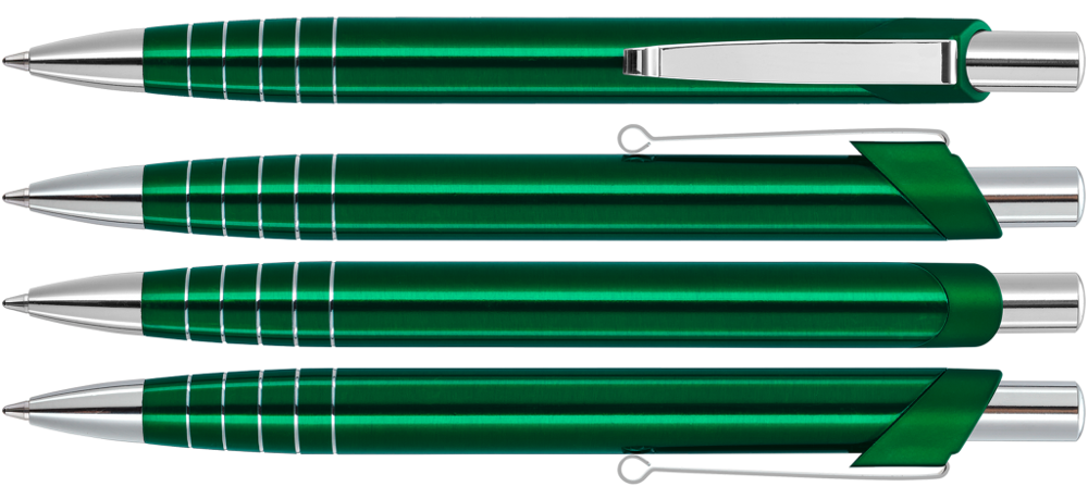Metall-Druckkugelschreiber mit silbernen Zierringen im Gehäuse und elastischem Metallclip. Spitze und Drücker silber glänzend.