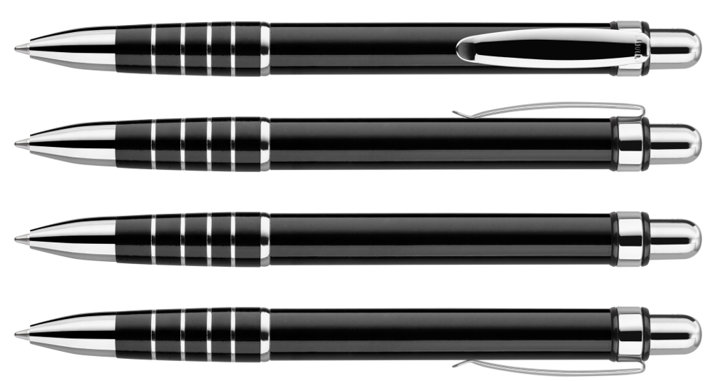 Metall-Druckkugelschreiber mit lackiertem Aluminiumschaft, Metallclip und Griffzone mit Ringdesign glanzverchromt.
