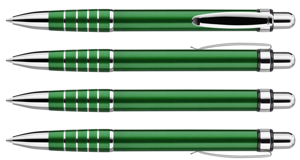Metall-Druckkugelschreiber mit lackiertem Aluminiumschaft, Metallclip und Griffzone mit Ringdesign glanzverchromt.