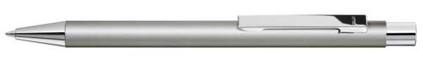 Metall-Druckkugelschreiber mit mattem Gehäuse. Metallclip, Metallspitze und Drücker silber glänzend.