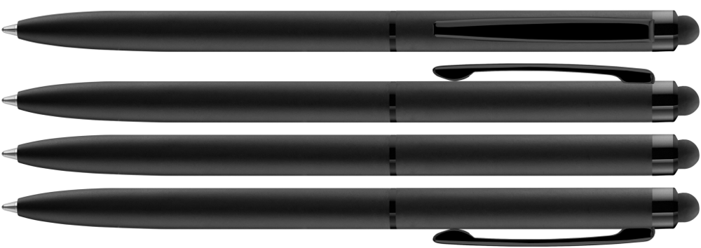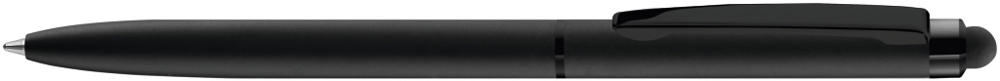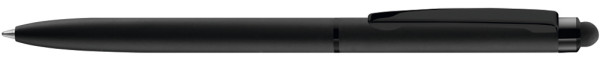 Metall-Drehkugelschreiber mit schwarz mattem Gehäuse und schwarz glänzenden Beschlagteilen. Gummiertes Schaftende für die Touchscreensteuerung.