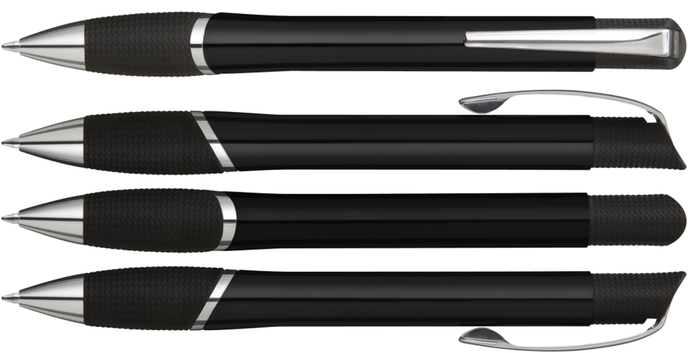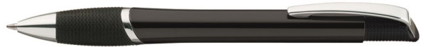Metall-Druckkugelschreiber mit glänzendem Gehäuse, schwarzer Gummigriffzone und glanzverchromten Beschlagteilen.