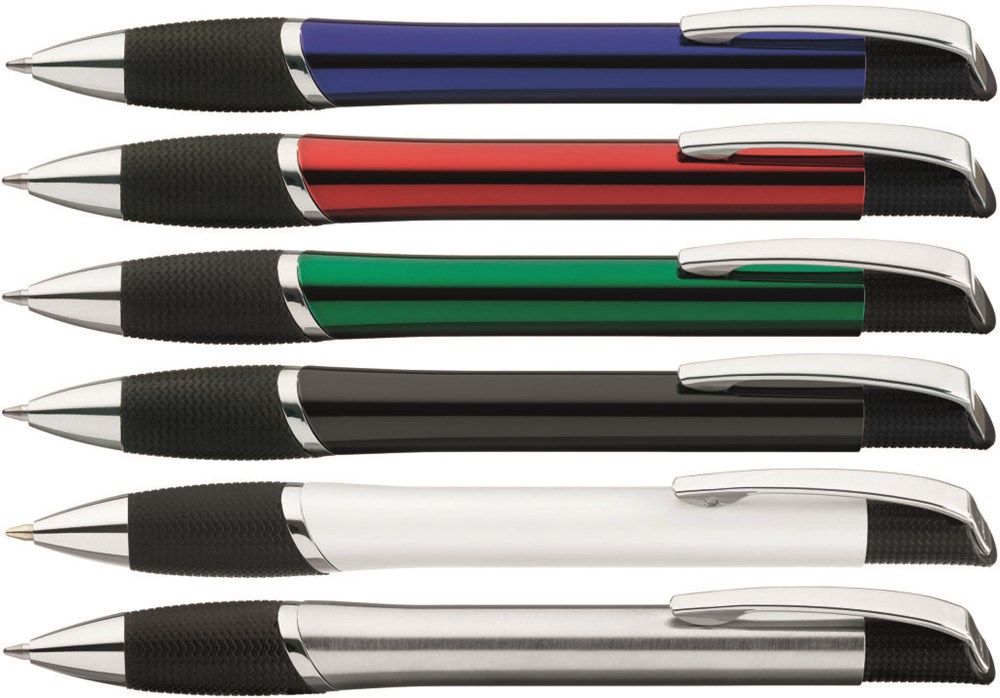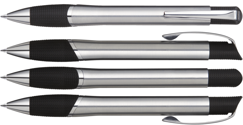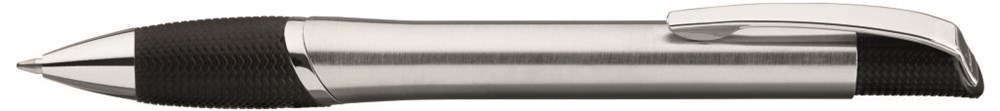 Metall-Druckkugelschreiber mit glänzendem Gehäuse, schwarzer Gummigriffzone und glanzverchromten Beschlagteilen.
