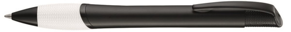 Metall-Druckkugelschreiber mit schwarz matt lackiertem Gehäuse, farbige Gummigriffzone und matt schwarzen Beschlagteilen.