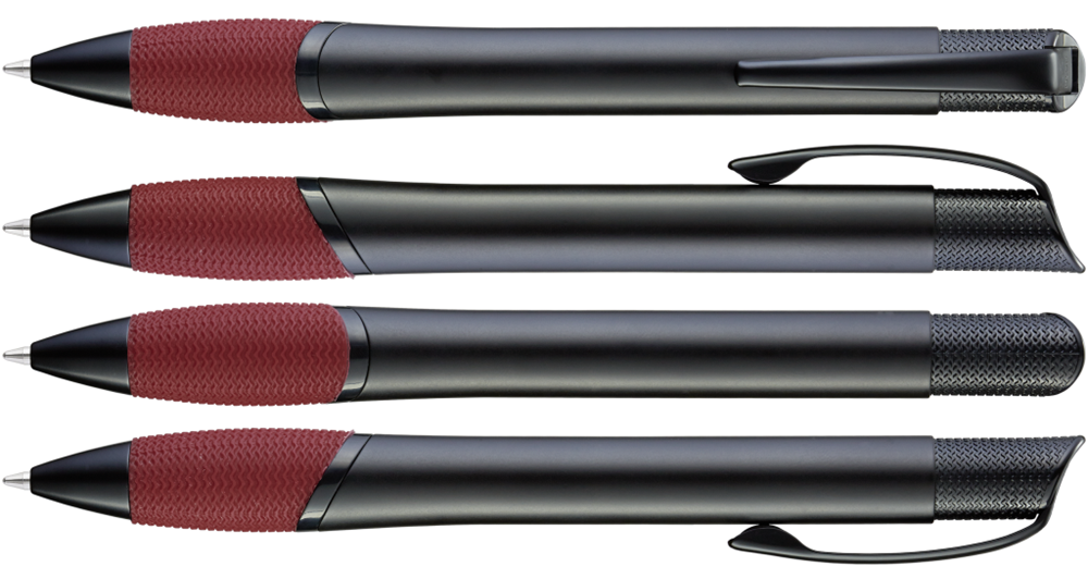 Metall-Druckkugelschreiber mit schwarz matt lackiertem Gehäuse, farbige Gummigriffzone und matt schwarzen Beschlagteilen.