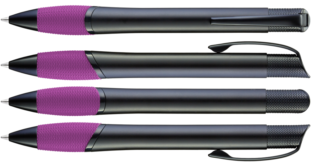 Metall-Druckkugelschreiber mit schwarz matt lackiertem Gehäuse, farbige Gummigriffzone und matt schwarzen Beschlagteilen.
