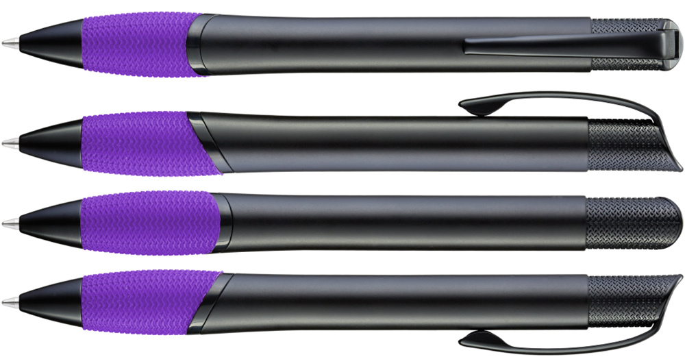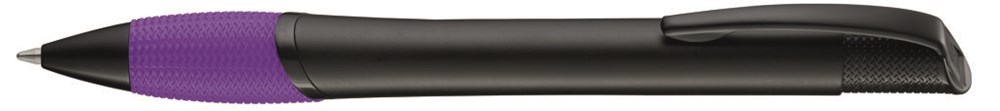 Metall-Druckkugelschreiber mit schwarz matt lackiertem Gehäuse, farbige Gummigriffzone und matt schwarzen Beschlagteilen.