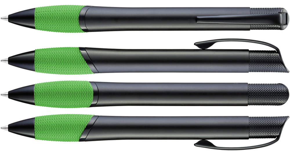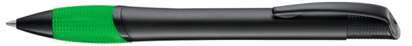 Metall-Druckkugelschreiber mit schwarz matt lackiertem Gehäuse, farbige Gummigriffzone und matt schwarzen Beschlagteilen.