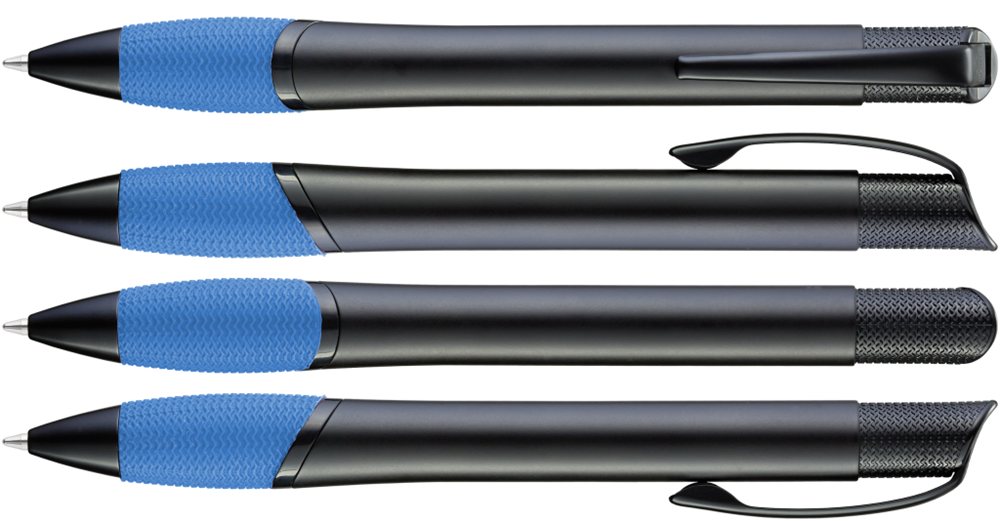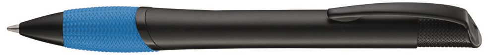 Metall-Druckkugelschreiber mit schwarz matt lackiertem Gehäuse, farbige Gummigriffzone und matt schwarzen Beschlagteilen.