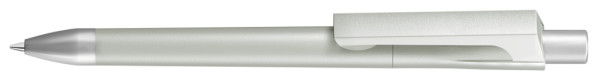 Druckkugelschreiber mit gedeckt mattem Gehäuse und schwerer Metallspitze matt verchromt.