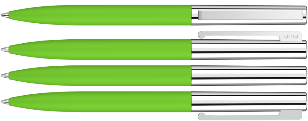 Metall-Drehkugelschreiber mit Softtouch-Schaft, glanzverchromtem Metalloberteil und gefederter Metallclip.