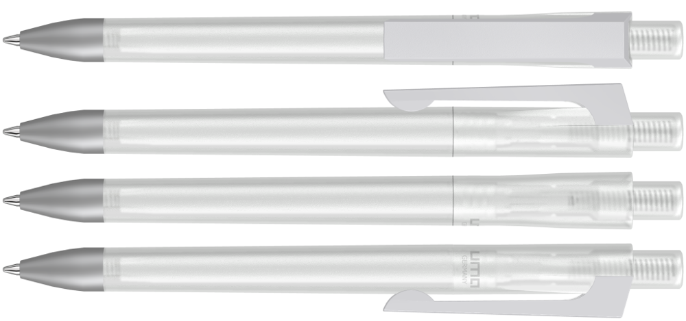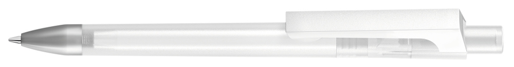 Druckkugelschreiber mit transparent gefrostetem Gehäuse und gedeckt mattem Clip in weiß. Schwere Metallspitze matt verchromt.