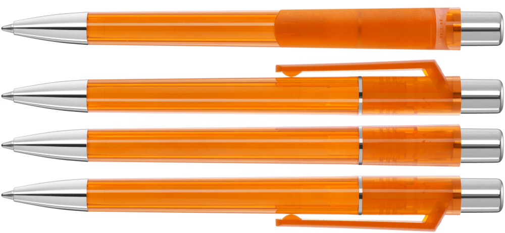 Druckkugelschreiber mit transparent glänzendem Gehäuse, Metallzierring, Drücker und schwere Metallspitze glanzverchromt.