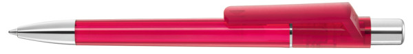 Druckkugelschreiber mit transparent glänzendem Gehäuse, Metallzierring, Drücker und schwere Metallspitze glanzverchromt.