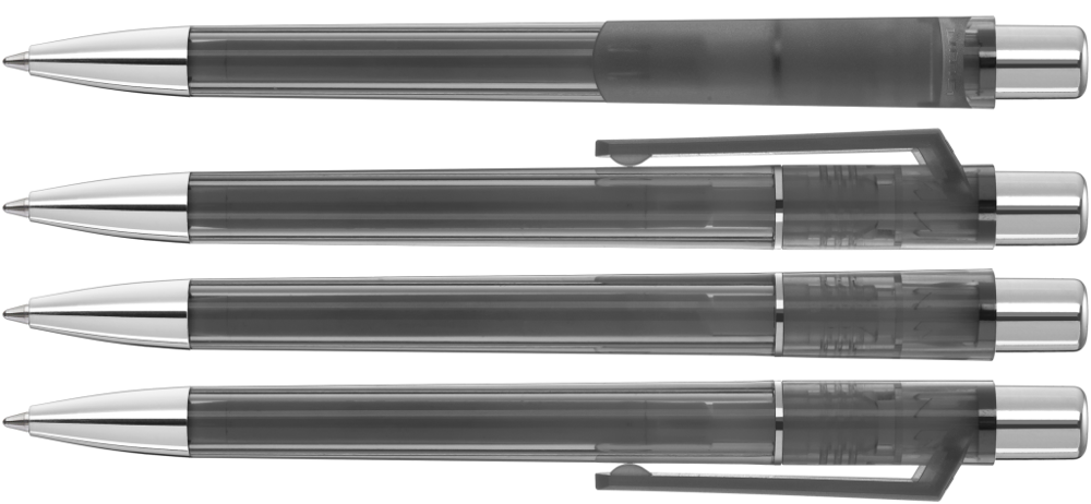 Druckkugelschreiber mit transparent glänzendem Gehäuse, Metallzierring, Drücker und schwere Metallspitze glanzverchromt.