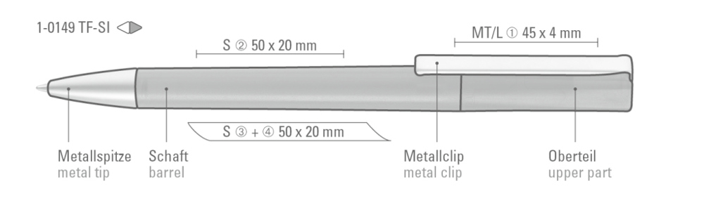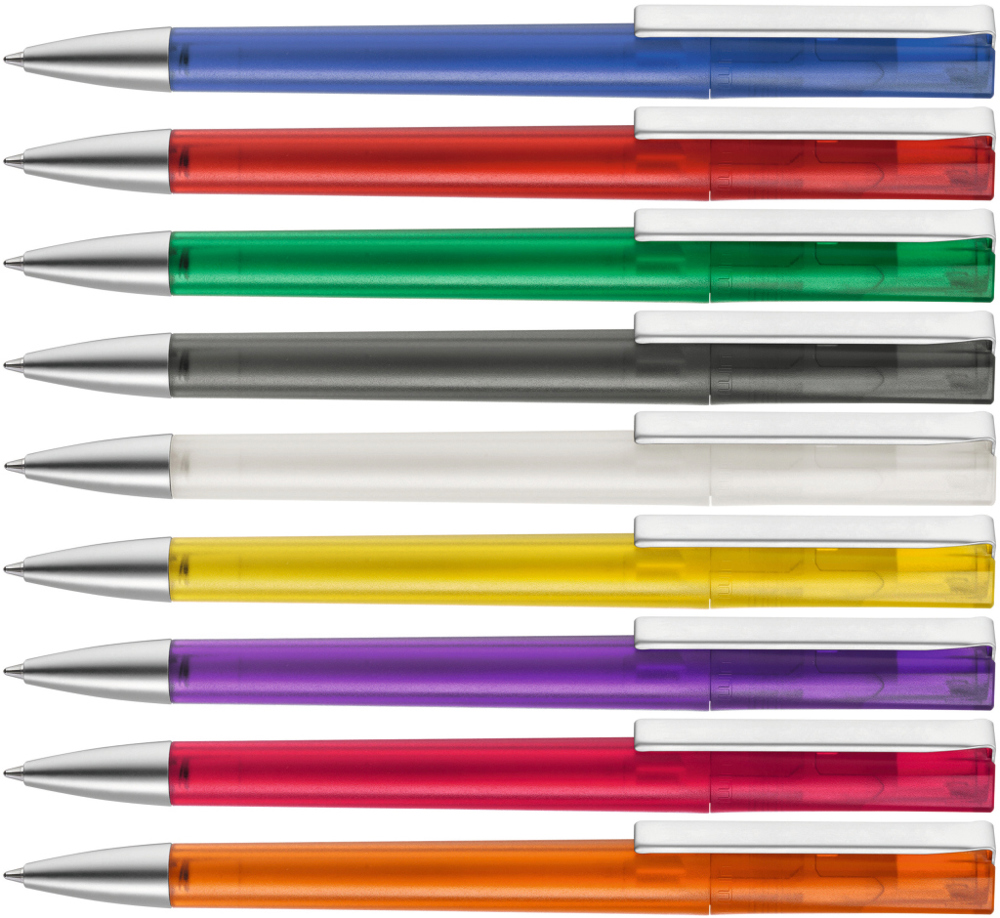 Drehkugelschreiber mit transparent gefrostetem Gehäuse, schwere Metallspitze und Metallclip matt verchromt.