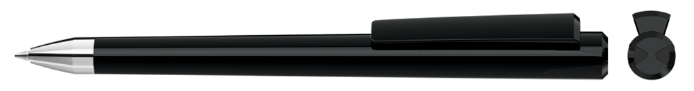 Drehkugelschreiber mit gedeckt glänzendem Gehäuse und Oberteil mit zwei farbigen Stopfen in gedeckt oder transparent. Schwere Metallspitze glanzverchromt.