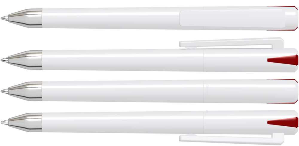 Drehkugelschreiber mit gedeckt glänzendem Gehäuse und Oberteil mit zwei farbigen Stopfen in gedeckt oder transparent. Schwere Metallspitze glanzverchromt.
