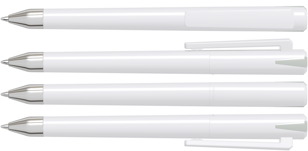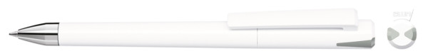 Drehkugelschreiber mit gedeckt glänzendem Gehäuse und Oberteil mit zwei farbigen Stopfen in gedeckt oder transparent. Schwere Metallspitze glanzverchromt.