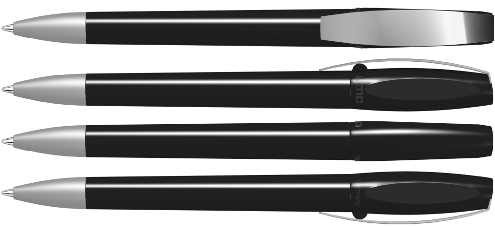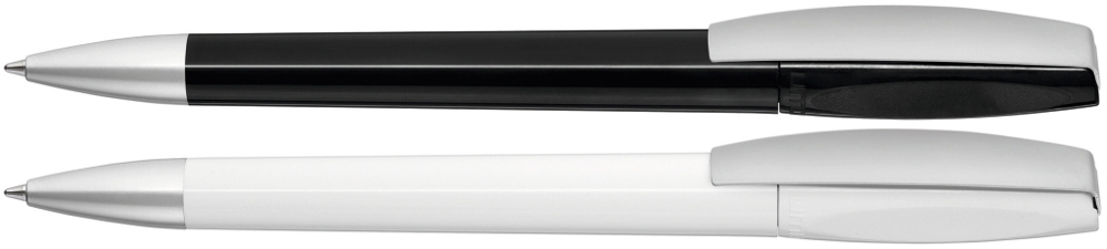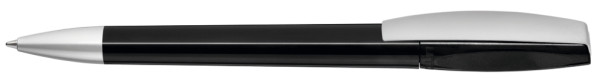 Drehkugelschreiber mit gedeckt glänzendem Gehäuse. Metallclip und schwere Metallspitze matt verchromt.