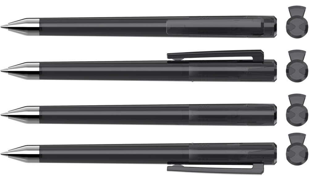 Drehkugelschreiber mit transparent glänzendem Gehäuse und Oberteil mit zwei farbigen Stopfen in gedeckt oder transparent glänzend. Schwere Metallspitze glanzverchromt.