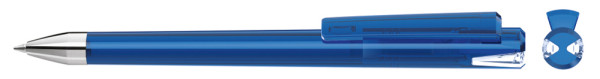Drehkugelschreiber mit transparent glänzendem Gehäuse und Oberteil mit zwei farbigen Stopfen in gedeckt oder transparent glänzend. Schwere Metallspitze glanzverchromt.