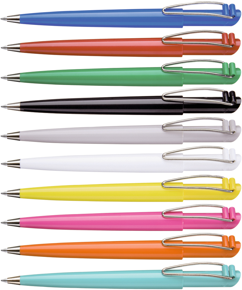 Druckkugelschreiber mit gedeckt glänzendem Gehäuse, vernickeltem Metallbiegeclip und Metallspitze.