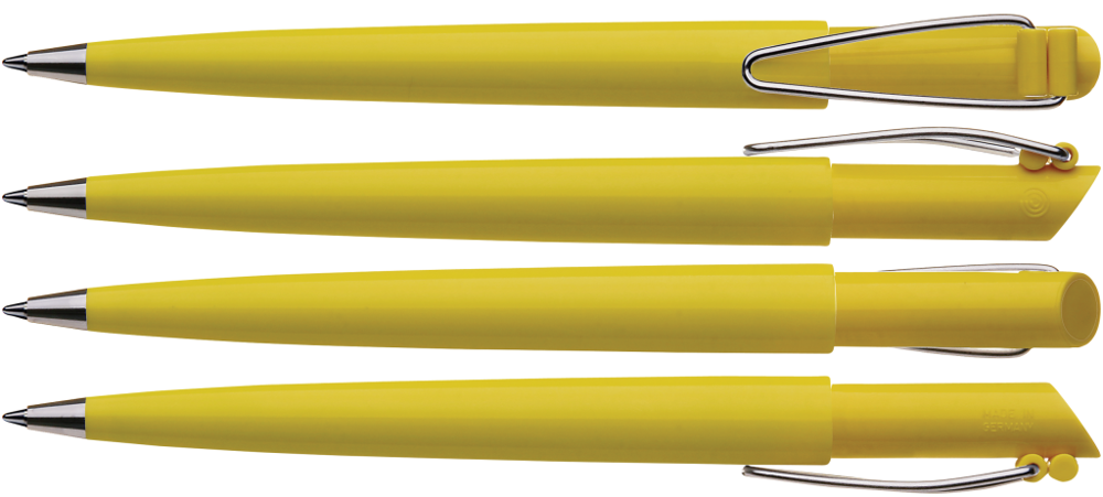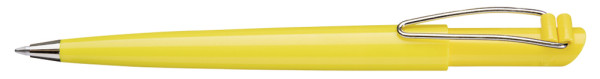 Druckkugelschreiber mit gedeckt glänzendem Gehäuse, vernickeltem Metallbiegeclip und Metallspitze.