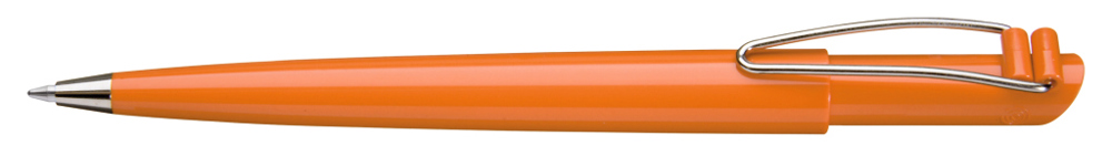 Druckkugelschreiber mit gedeckt glänzendem Gehäuse, vernickeltem Metallbiegeclip und Metallspitze.