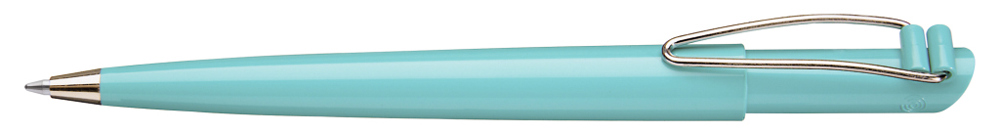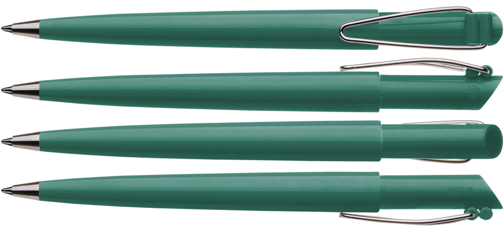 Druckkugelschreiber mit gedeckt glänzendem Gehäuse, vernickeltem Metallbiegeclip und Metallspitze.