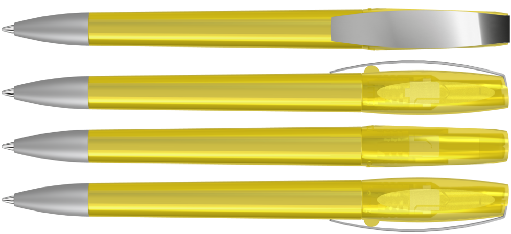 Drehkugelschreiber mit transparent glänzendem Gehäuse. Metallclip und schwere Metallspitze matt verchromt.