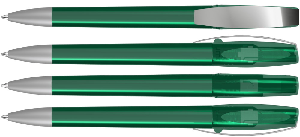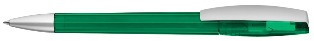 Drehkugelschreiber mit transparent glänzendem Gehäuse. Metallclip und schwere Metallspitze matt verchromt.