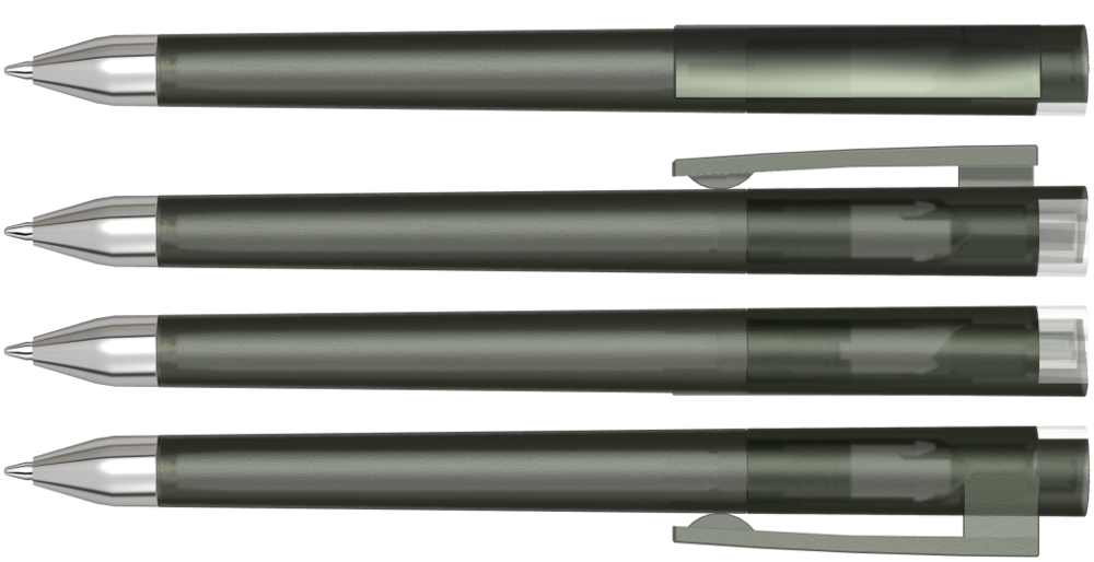 Drehkugelschreiber mit gefrostetem Gehäuse, Clip und Stopfen im Oberteil gedeckt glänzend bzw. transparent glänzend. Schwere Metallspitze glanzverchromt.