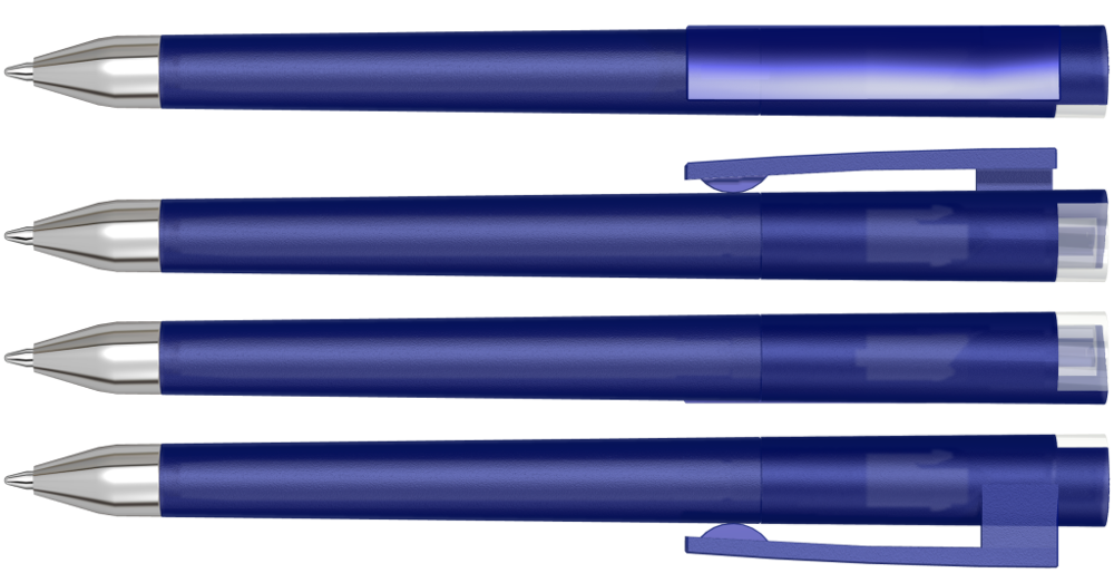 Drehkugelschreiber mit gefrostetem Gehäuse, Clip und Stopfen im Oberteil gedeckt glänzend bzw. transparent glänzend. Schwere Metallspitze glanzverchromt.