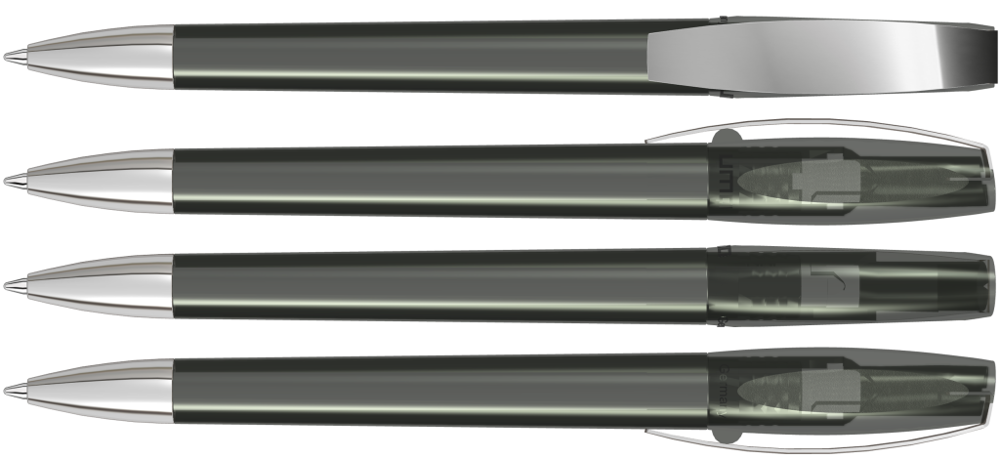 Drehkugelschreiber mit transparent glänzendem Gehäuse. Metallclip und schwere Metallspitze verchromt.