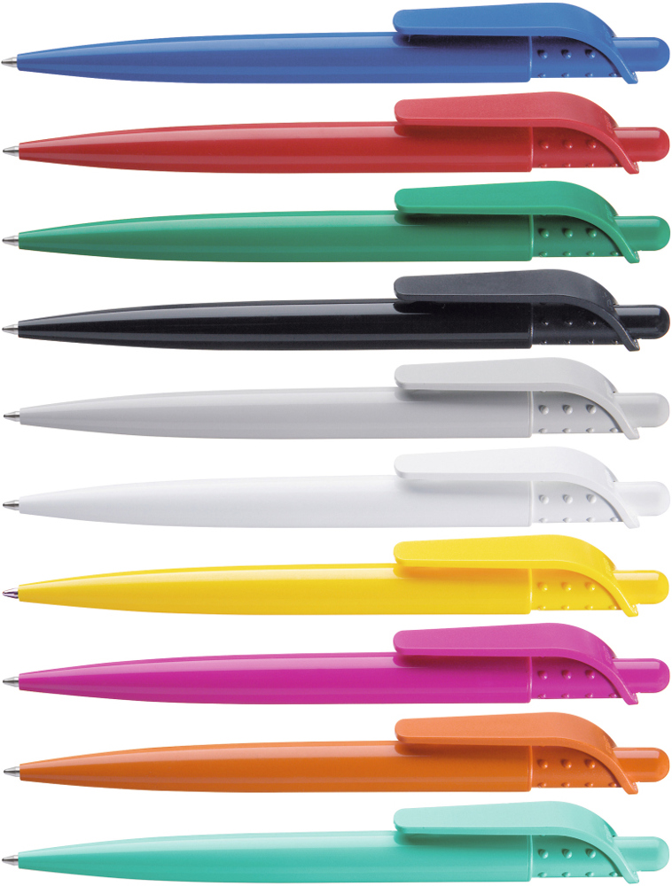 Druckkugelschreiber mit gedeckt glänzendem Gehäuse und großem Clip an genoppter Clipaufhängung.