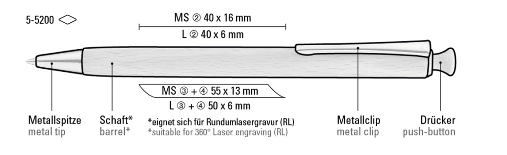 Holz-Druckkugelschreiber mit Holzdrücker, Metallclip und Metallspitze silber glänzend. Schaft und Drücker aus schutzlackiertem PEFC-zertifiziertem Buchenholz.